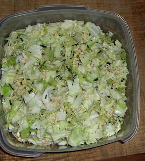 It sits overnight in the frig and tomorrow we mix the oil and the vinegar and the beef packets together and pour it over the cabbage and toss it! Pretty simple! We can't wait to taste it!